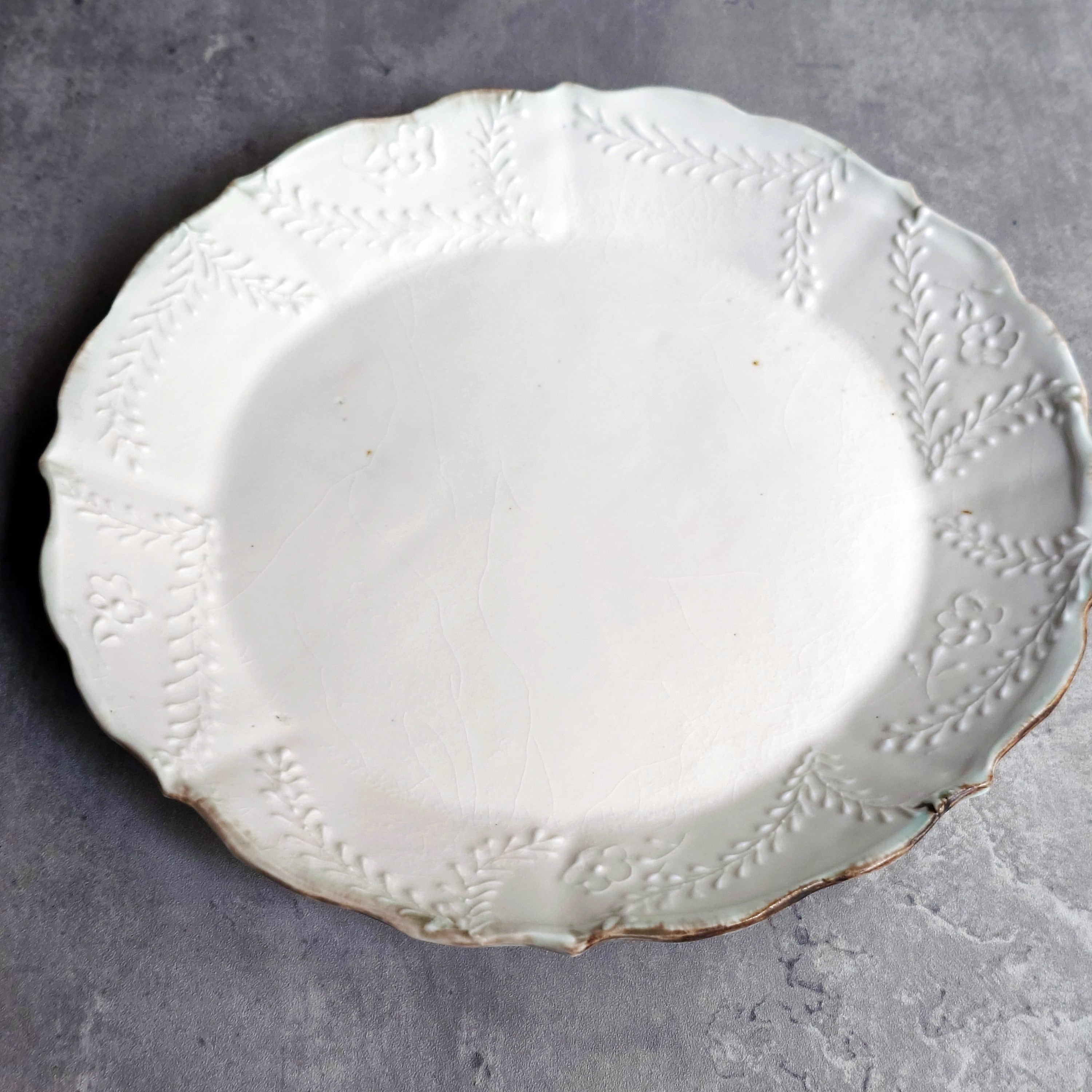 一つひとつ手作業で丁寧に仕上げられたこのお皿は、表面に施されたローズマリー模様のエンボス加工が魅力的で、日常のテーブルに自然の温もりを添えてくれます。