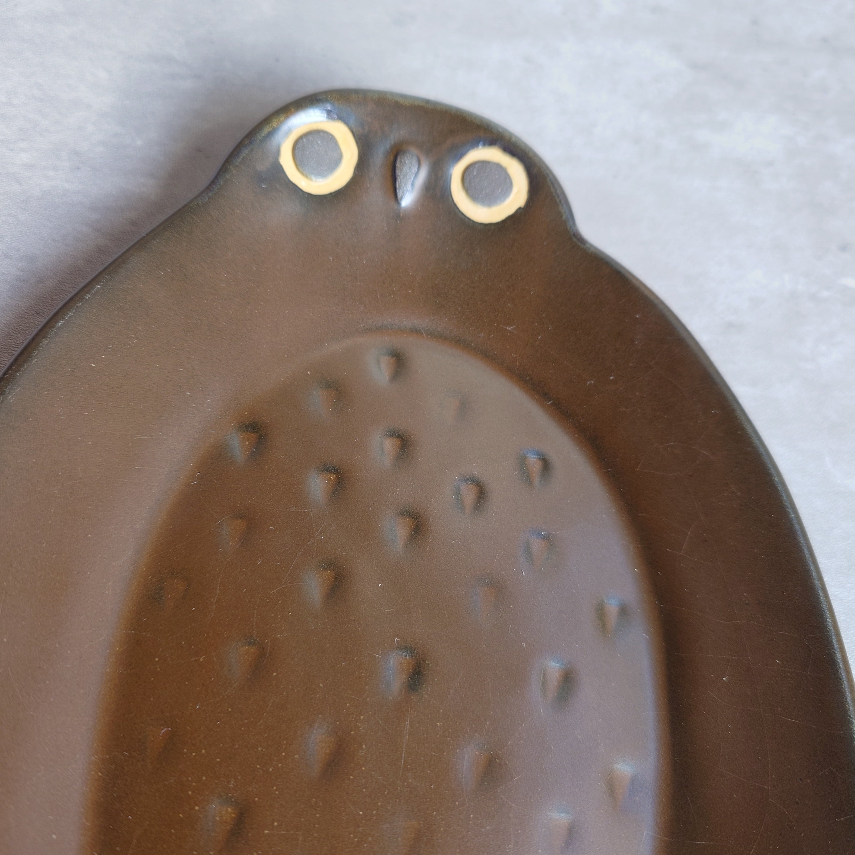 リュウキュウアオバズクのお皿。くりっとした目でこちらを見つめています。