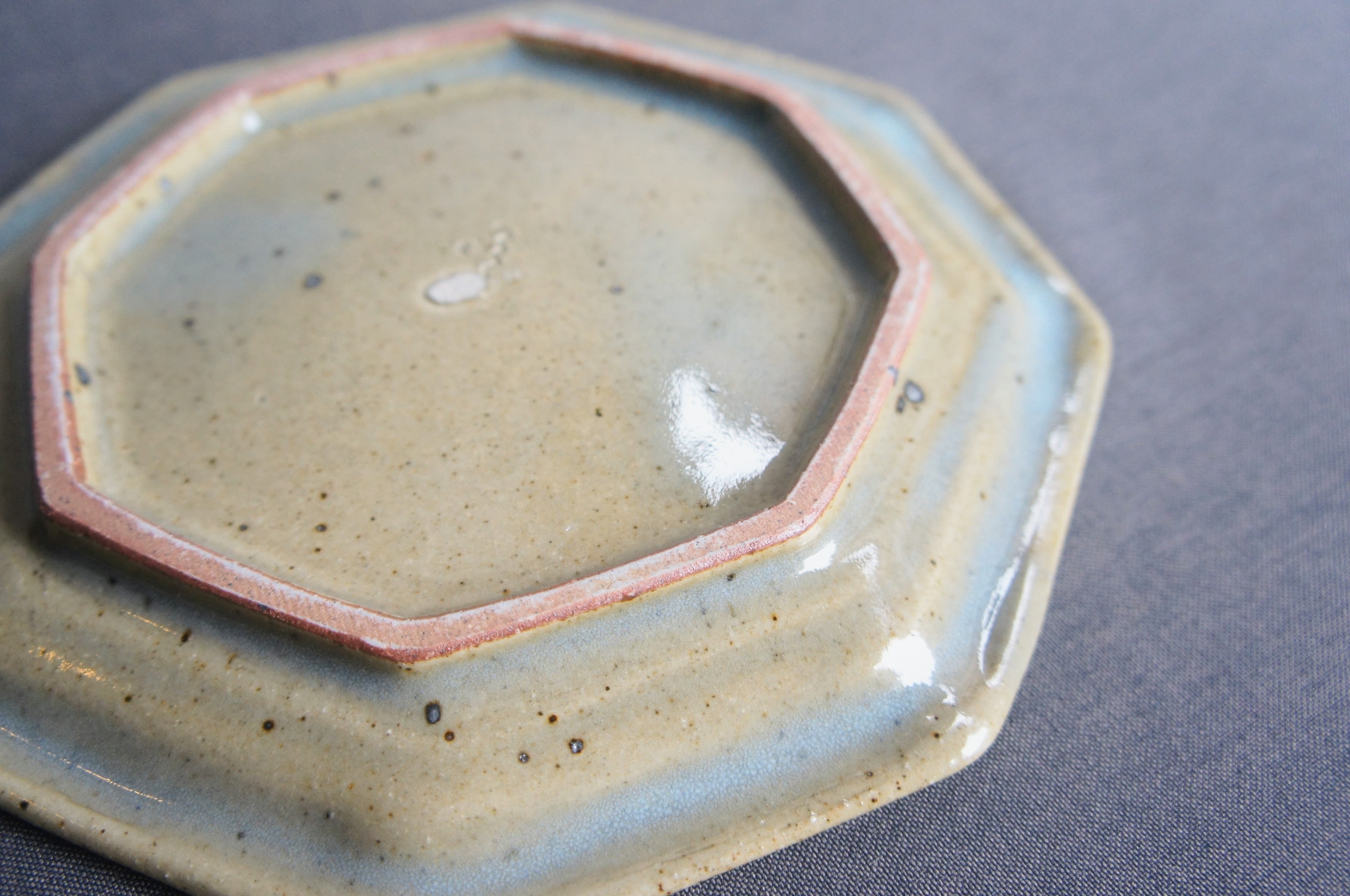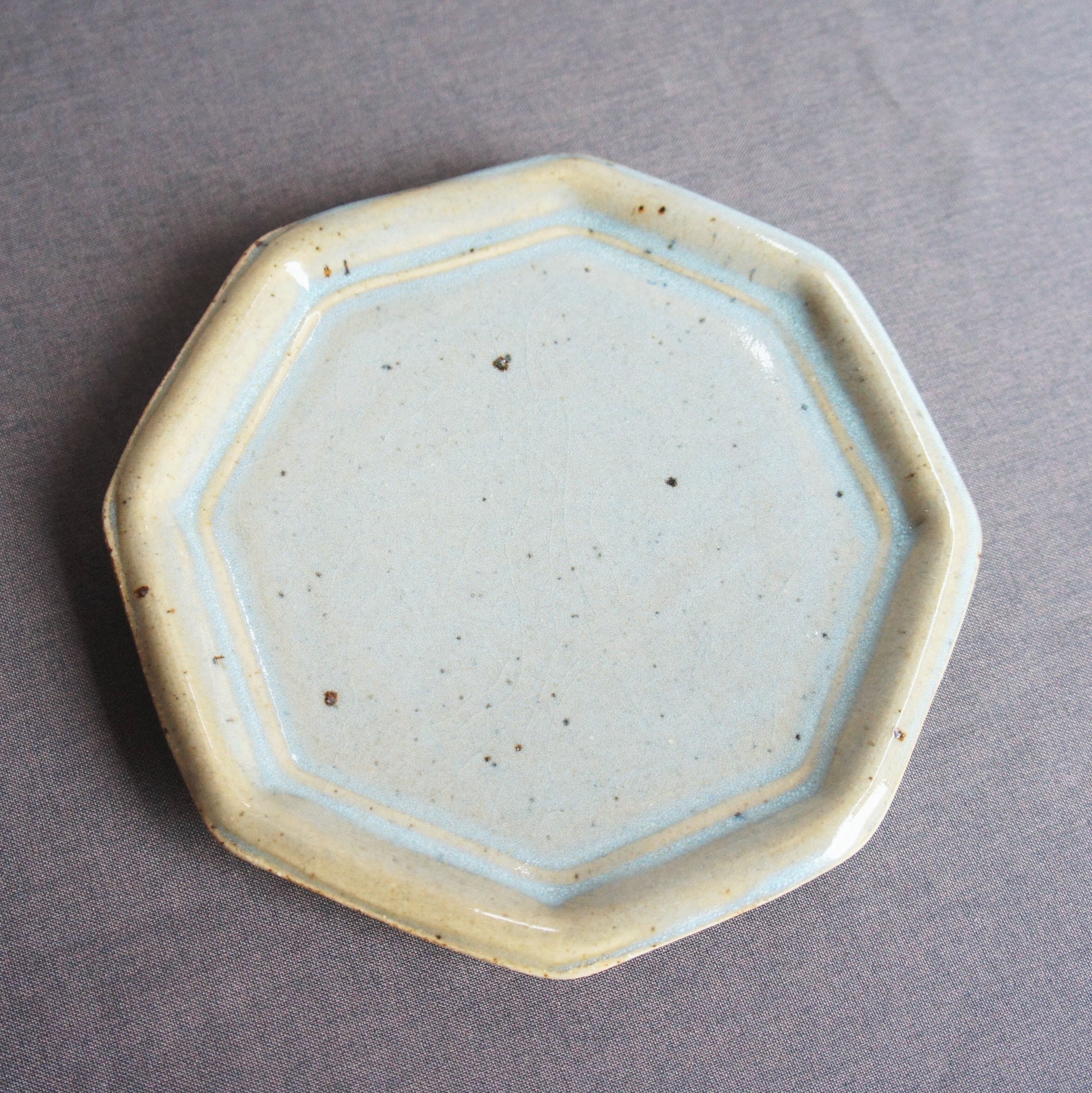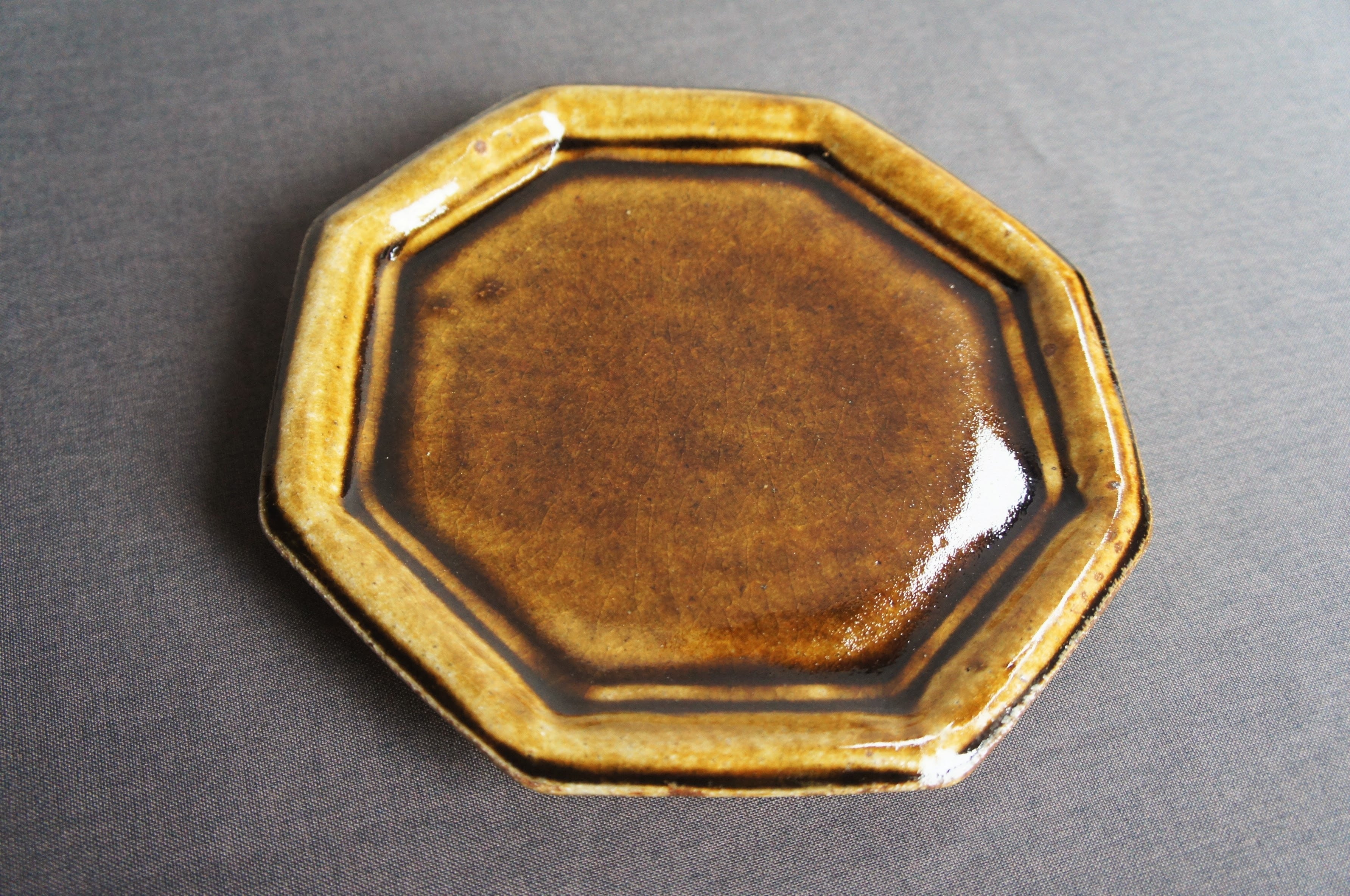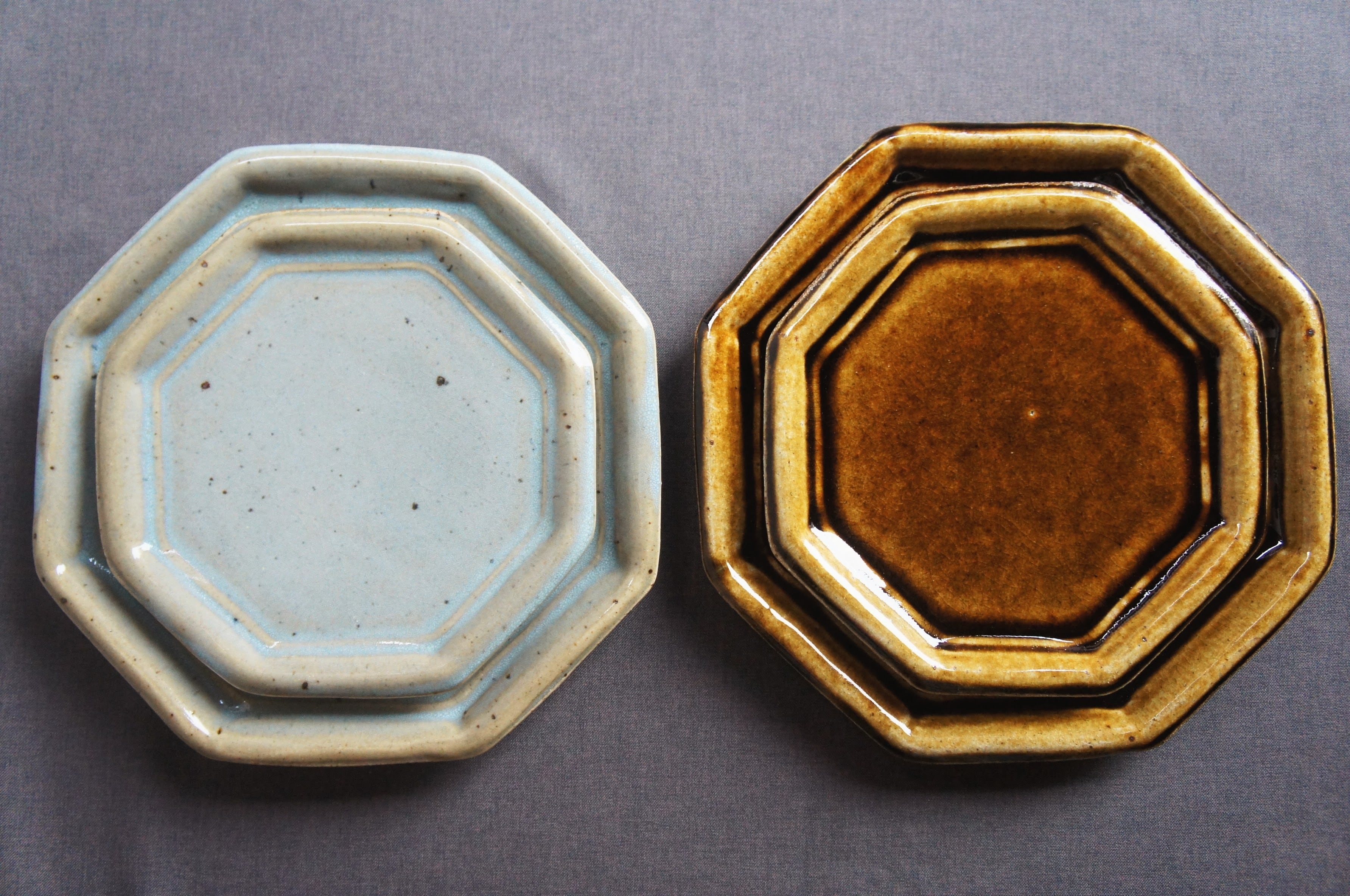 熊本県天草の陶房スイさん しっかりとした厚みと温もりがあります。 釉薬は、光沢があって、高級感が出ています。 カラー2色で、深めのブラウンと、緑がかった綺麗なグレーです。 ヨーロッパのビストロで出てきそうな空気感。 八角のフラットプレート、小サイズ。 前菜の盛り合わせ、デザートプレートなどに。 サイズ2種類あるので、大きい方とセットでも使い勝手が良さそうです。 サイズ:直径19センチ