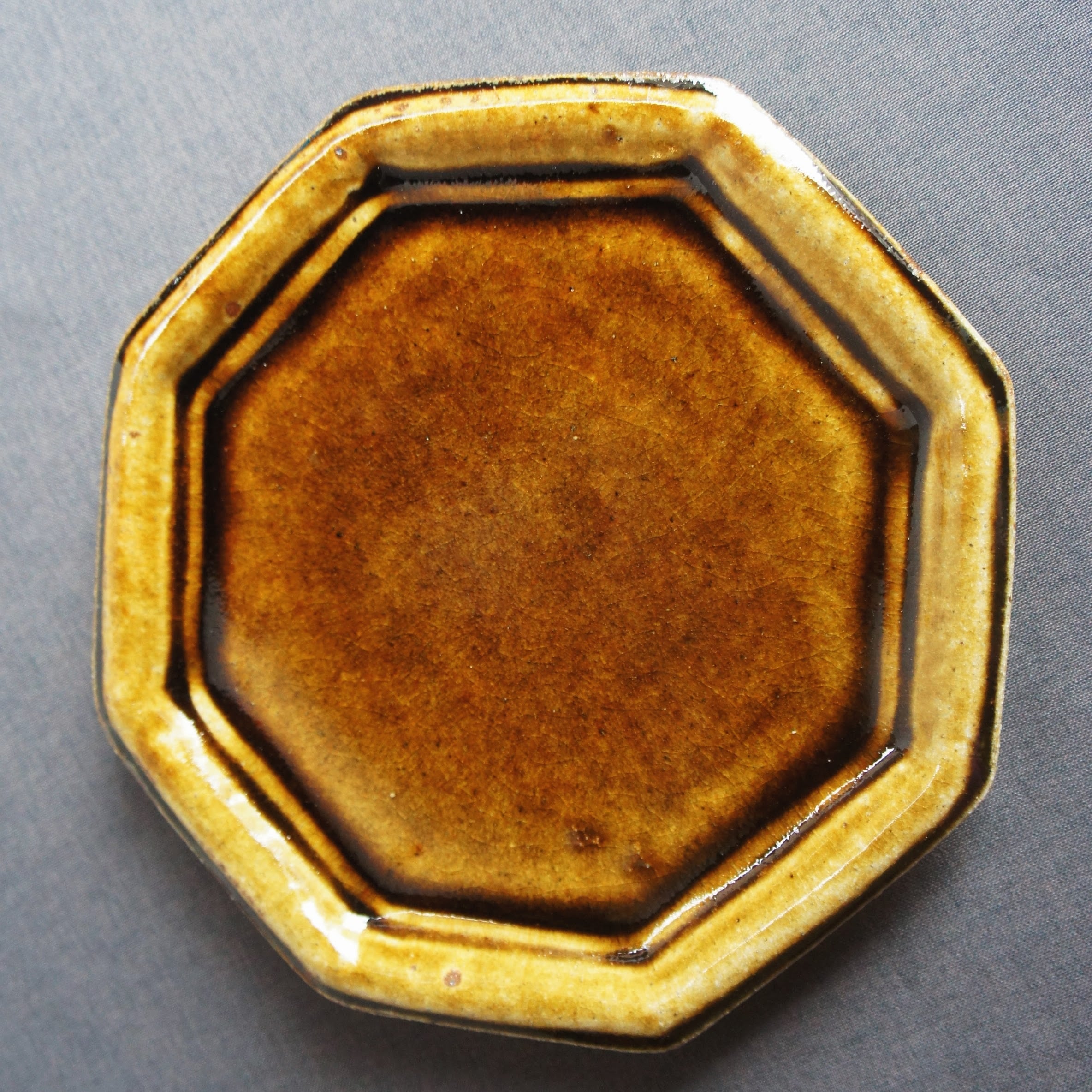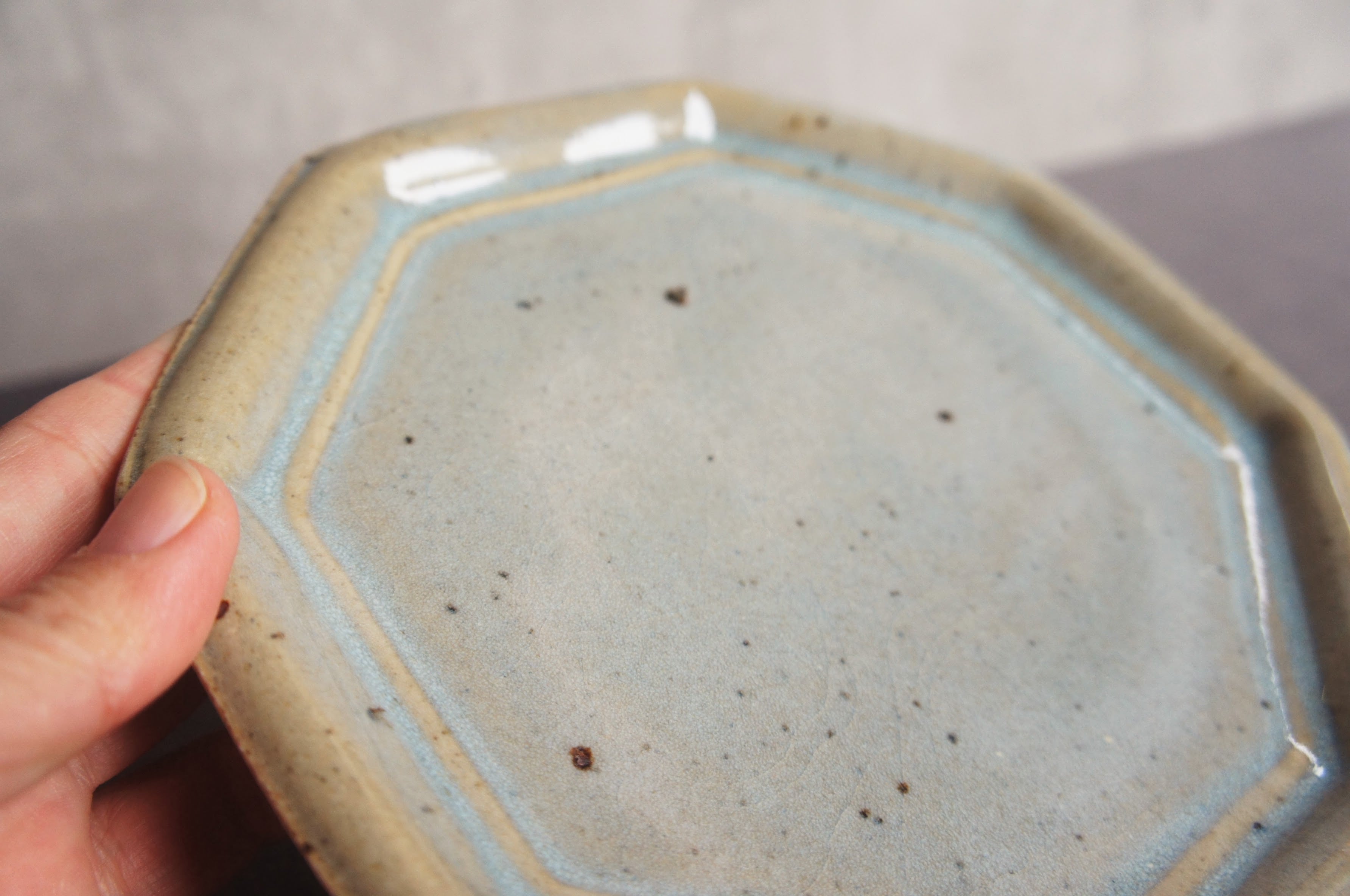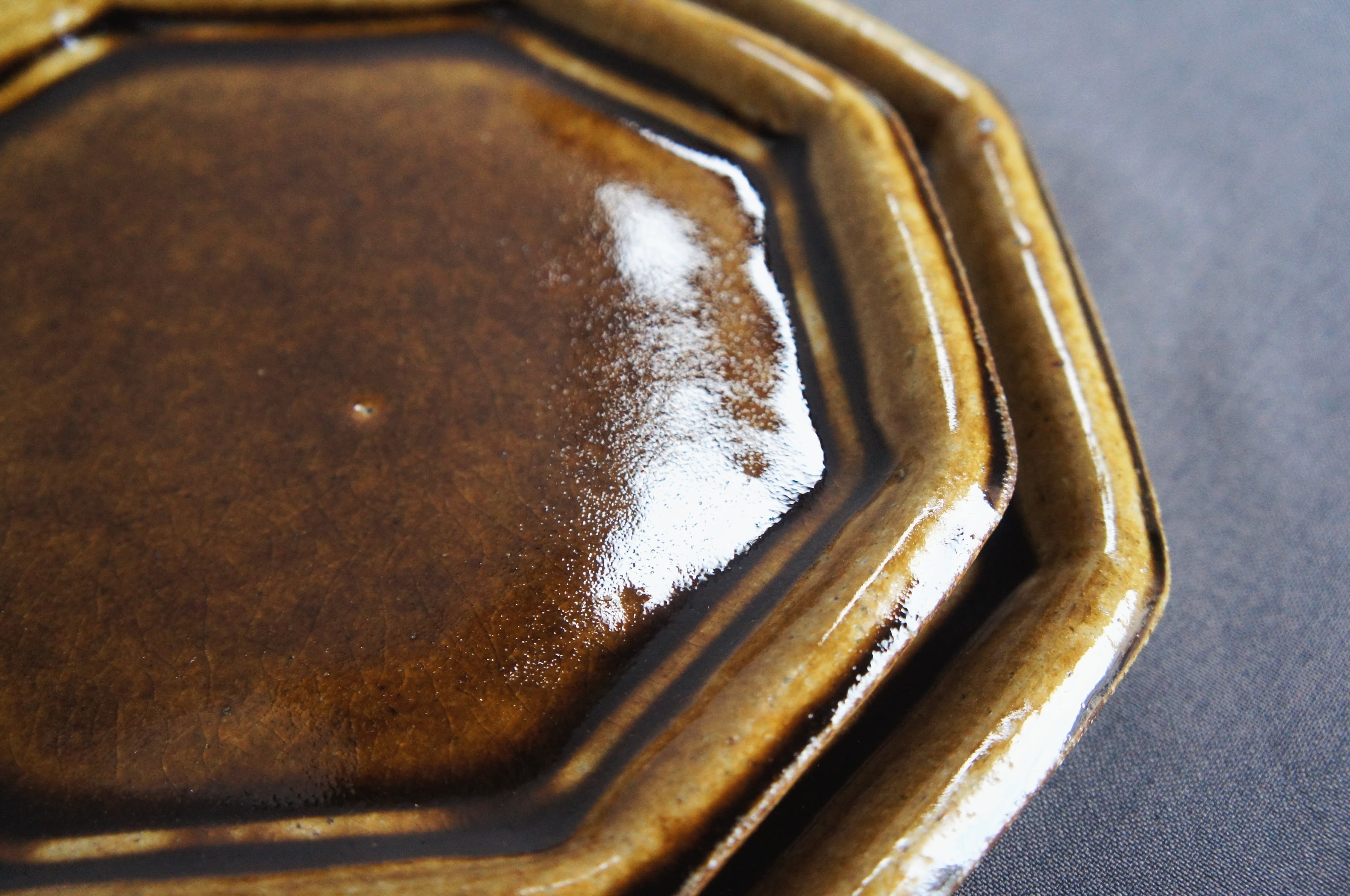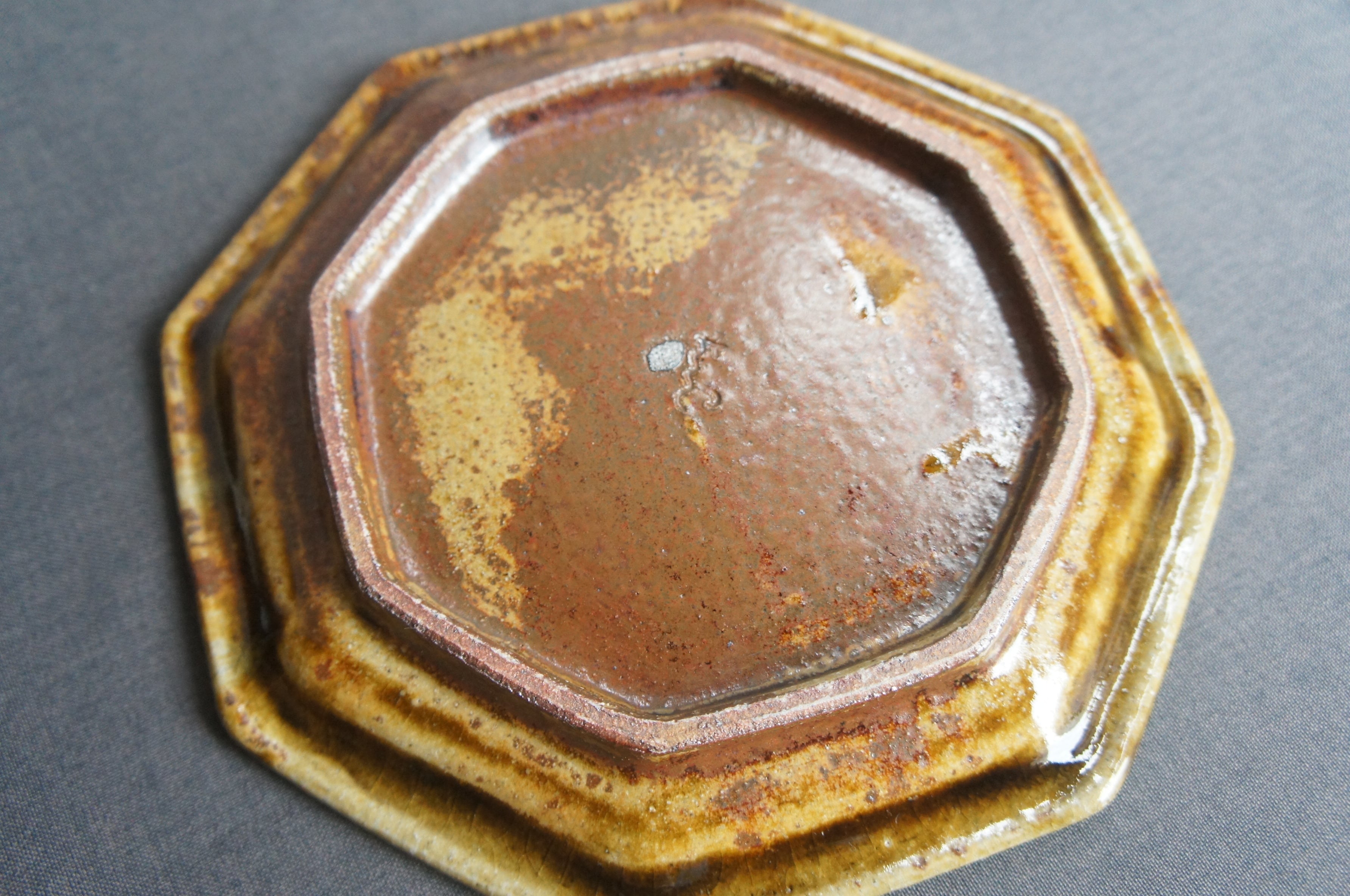 熊本県天草の陶房スイさん しっかりとした厚みと温もりがあります。 釉薬は、光沢があって、高級感が出ています。 カラー2色で、深めのブラウンと、緑がかった綺麗なグレーです。 ヨーロッパのビストロで出てきそうな空気感。 八角のフラットプレート、小サイズ。 前菜の盛り合わせ、デザートプレートなどに。 サイズ2種類あるので、大きい方とセットでも使い勝手が良さそうです。 サイズ:直径19センチ