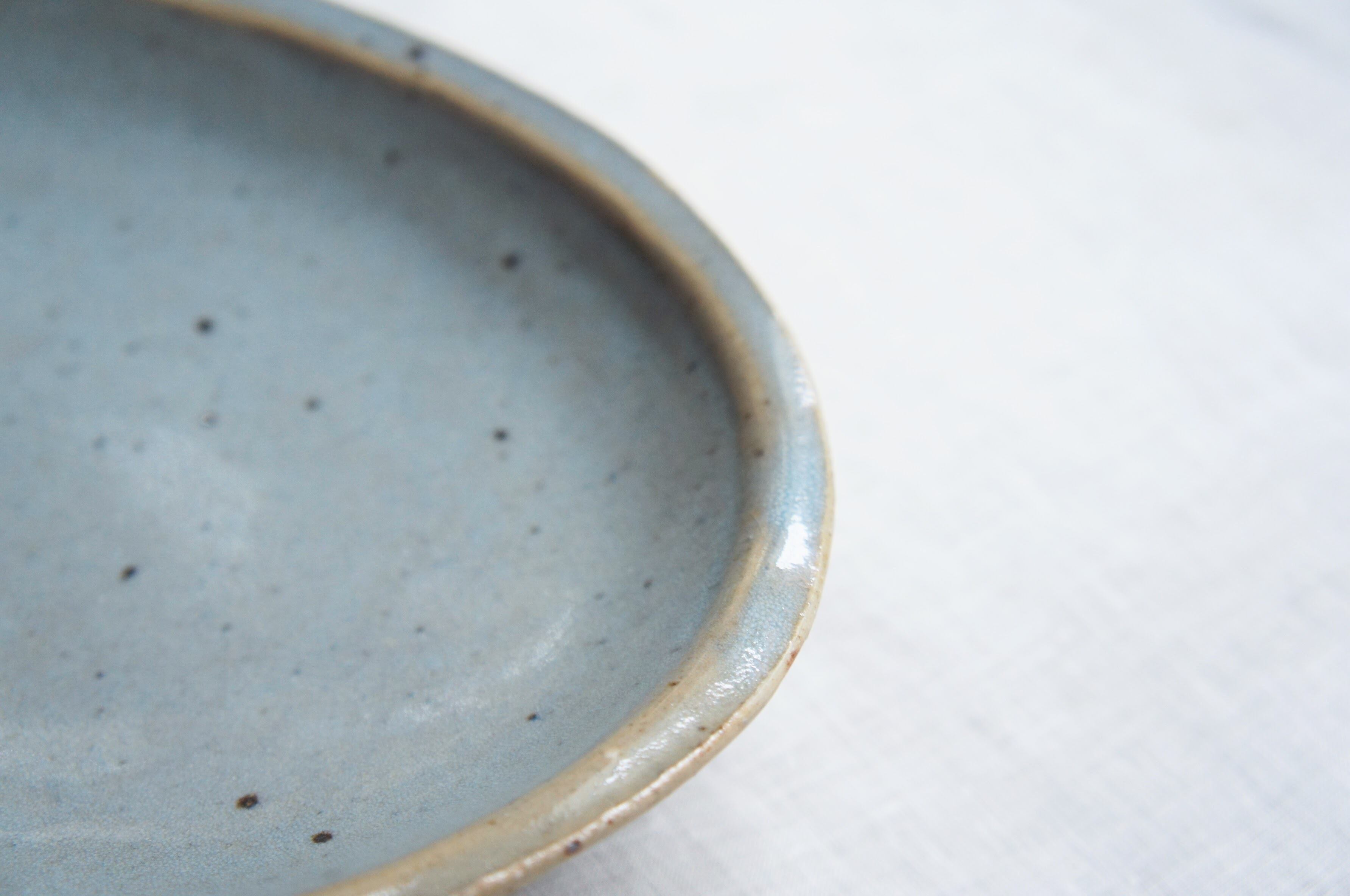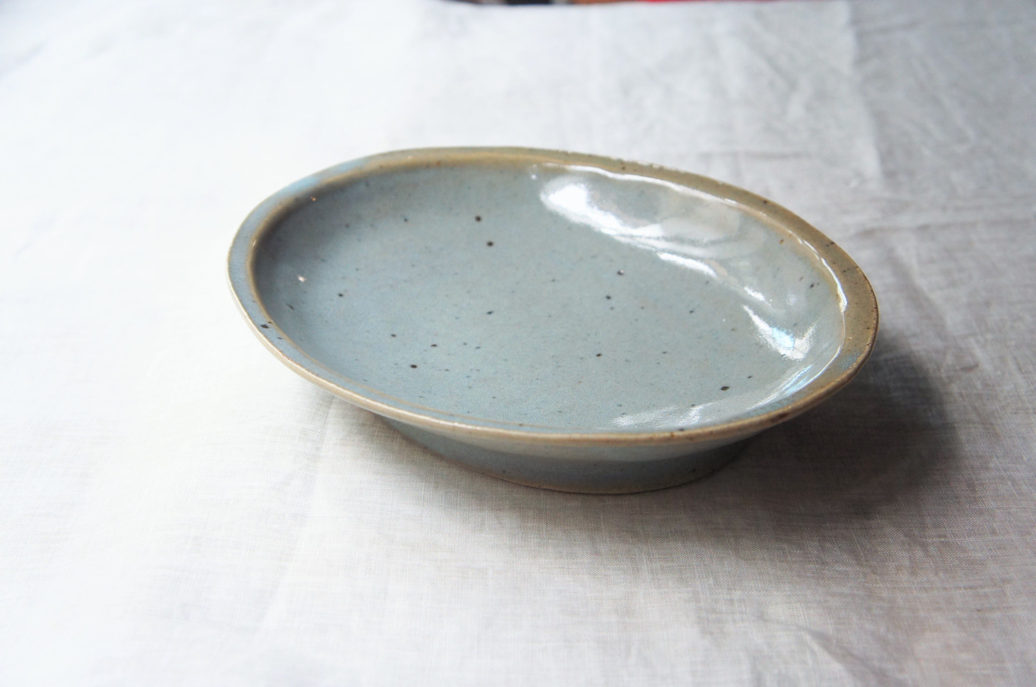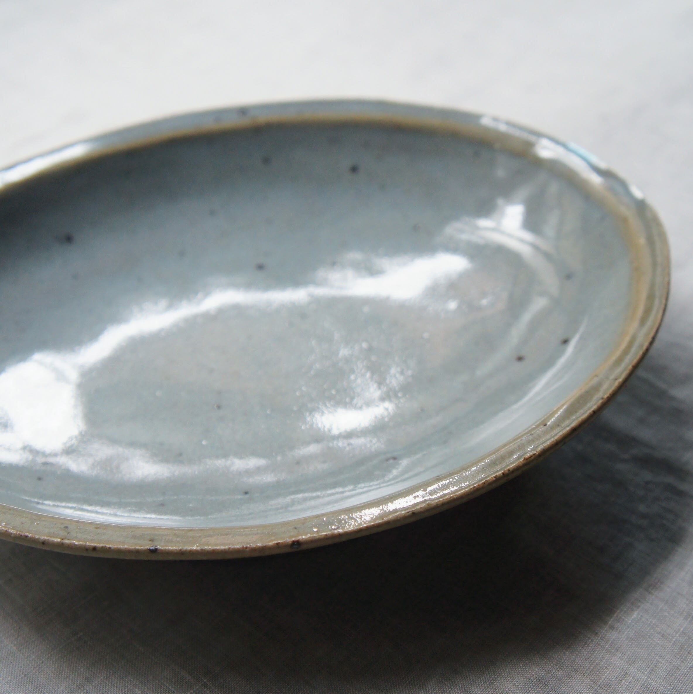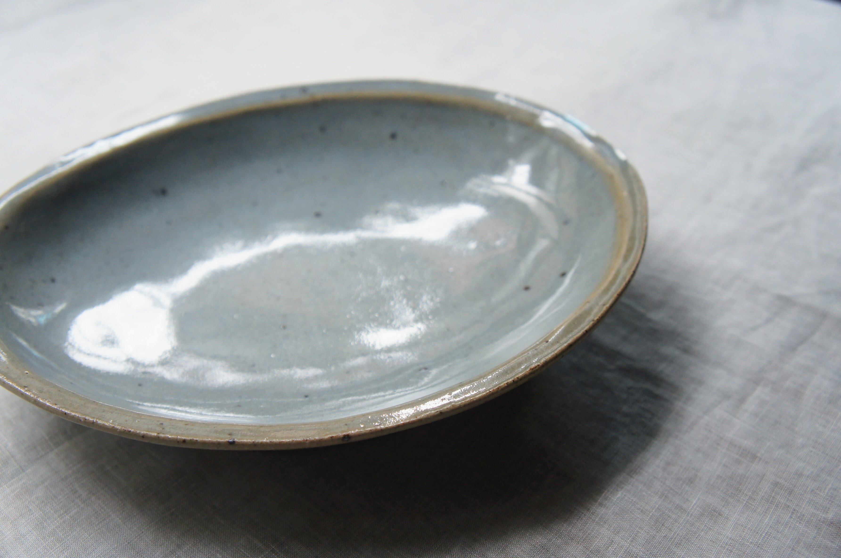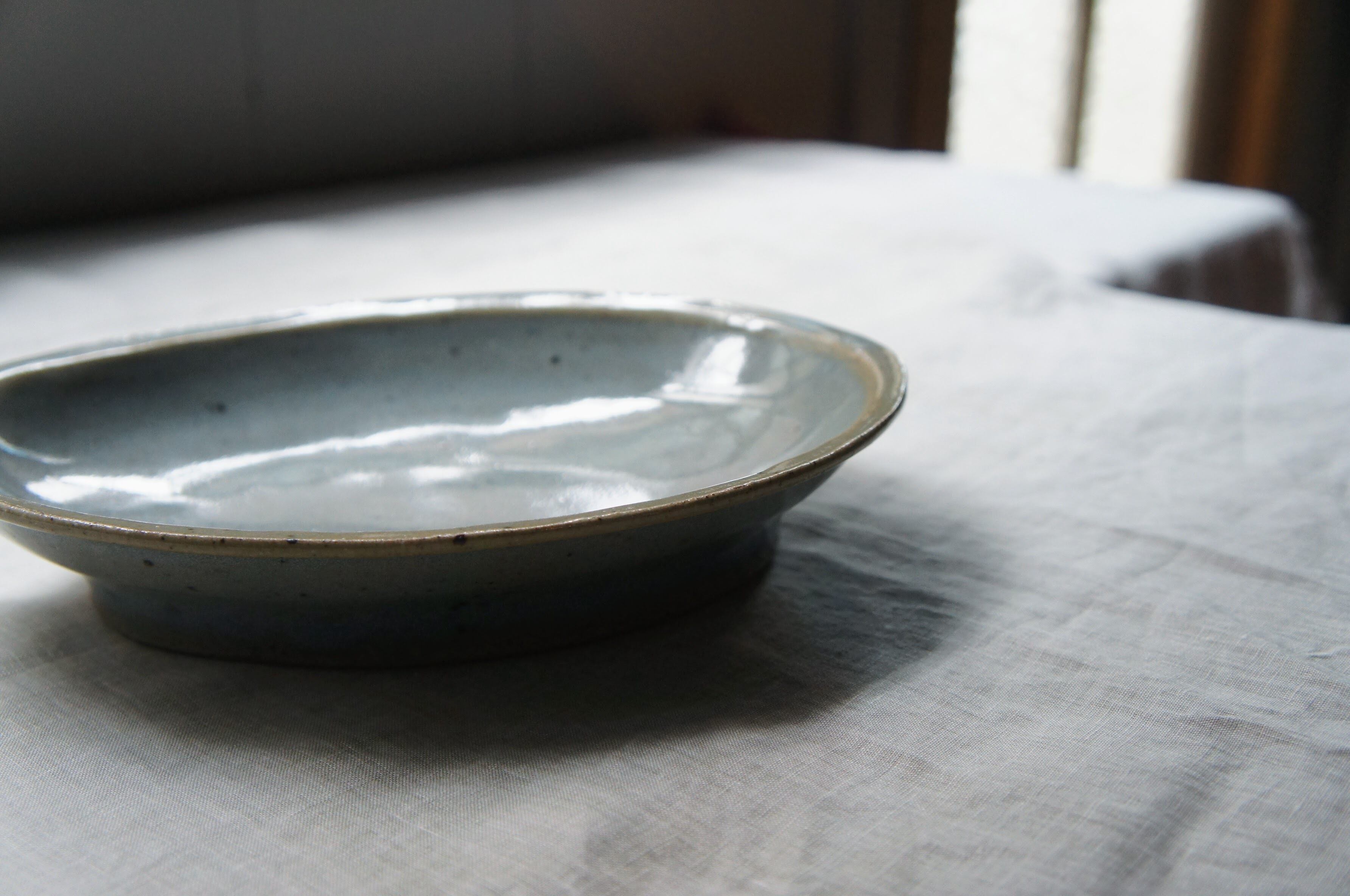 熊本県天草の陶房スイさん しっかりとした厚みと温もりのオーバルプレート。 光沢のある釉薬で、シンプルなカラーリングですが、華やかさもあります。 グレーの色味は、水色がかった釉薬の溜まりが美しくモダンな印象です。 ヨーロッパのビストロで出てきそうな器。 炒めものをざっとのせてもいいし、カレー皿にもぴったりです。 天草の土、素材を使ったお料理を盛りつけやすい器です。 ビストロ気分をご自宅で! サイズ:長さ 25センチ、幅 20センチ