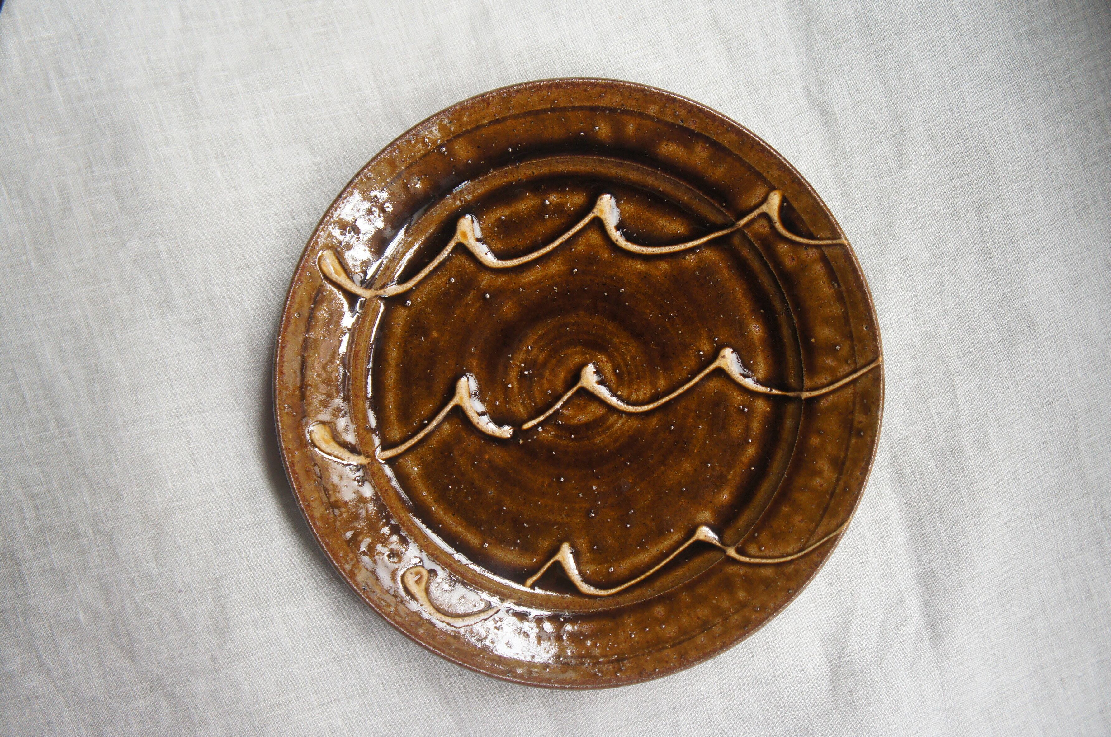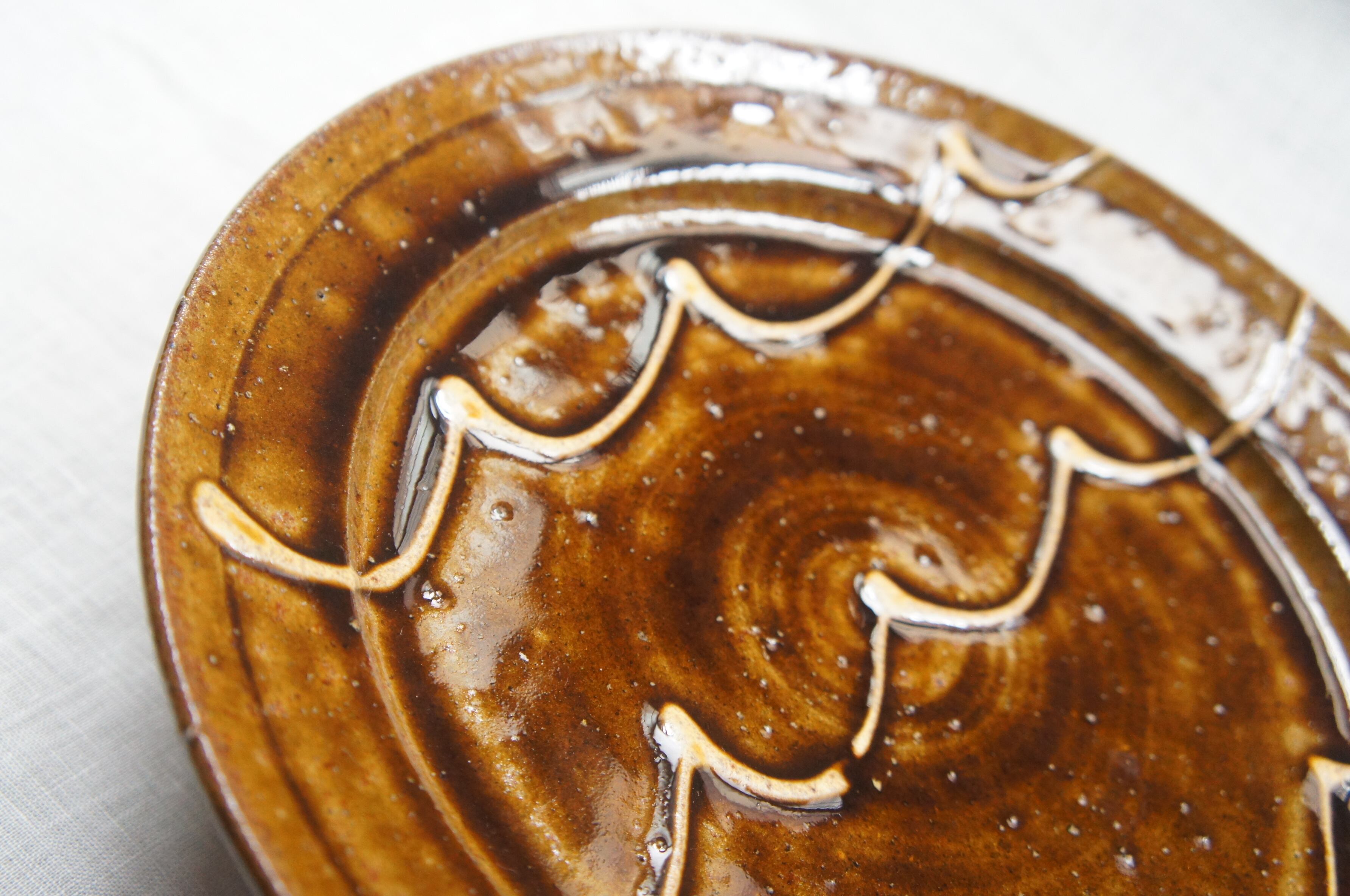 艶やかな飴釉の深いブラウンに、ゆらりと流れるような彫り模様。