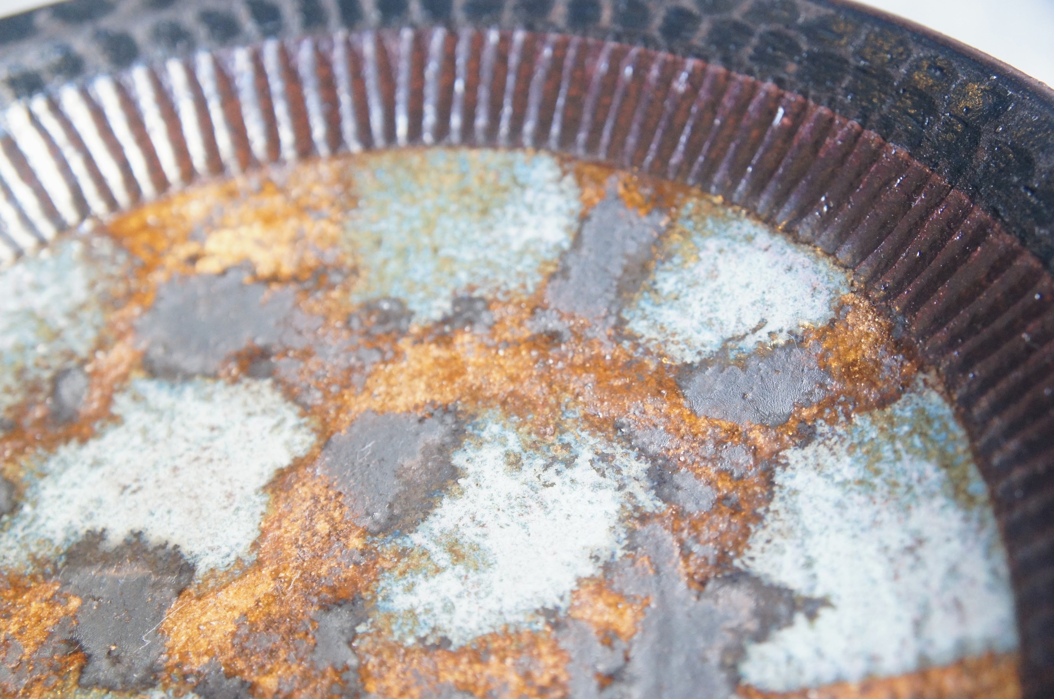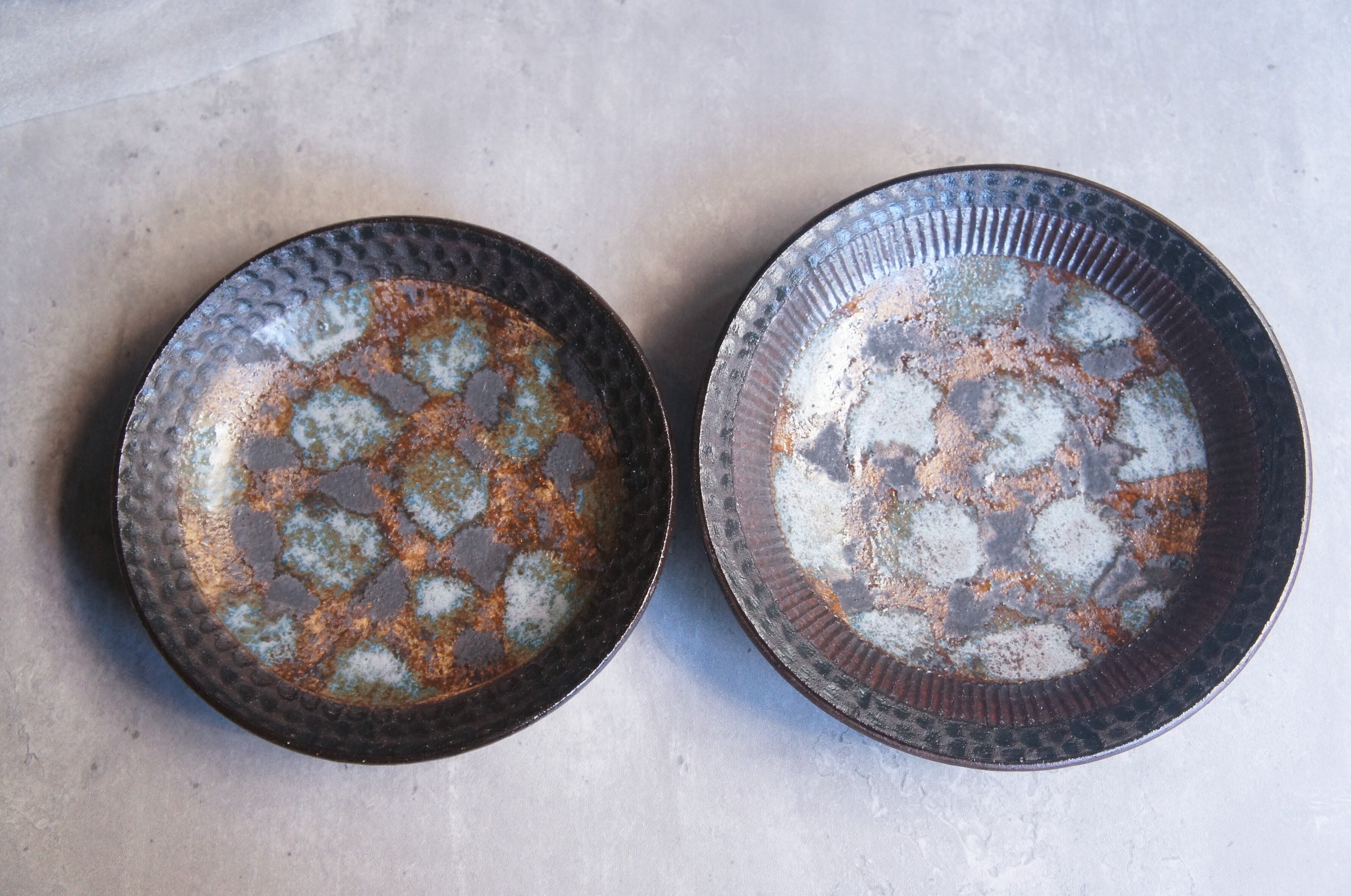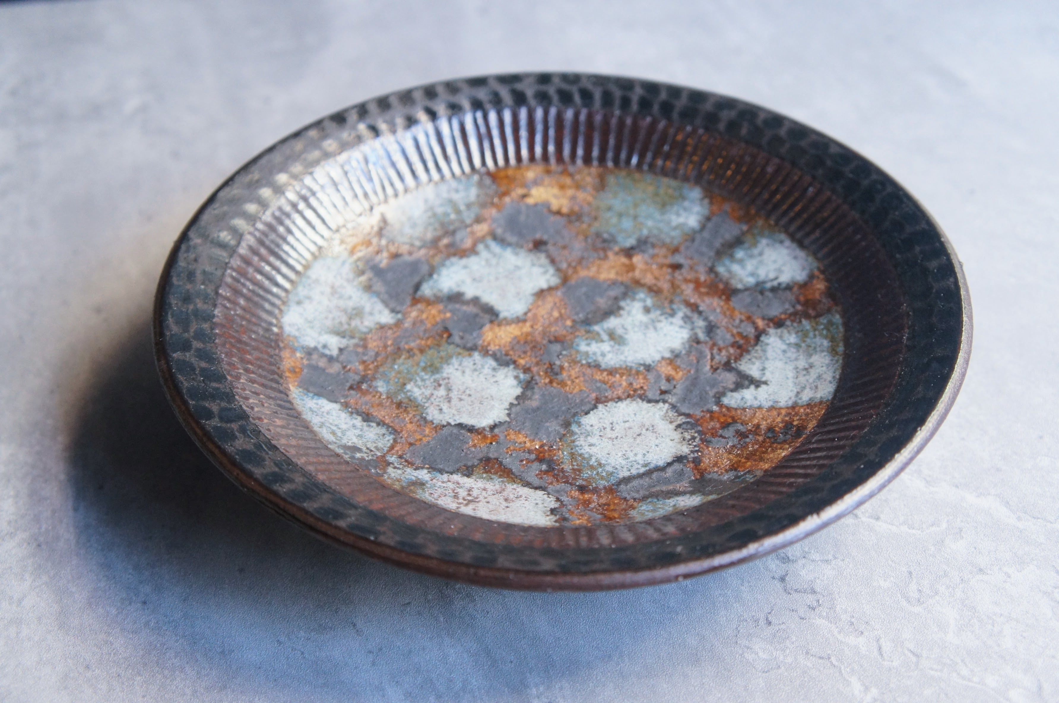 沖縄に住む陶芸作家のsuiさんの黒シリーズ。 7寸皿。 厚みもあってしっかり。重厚感と高級感が漂います。 全体はダークブラウンがベースで、部分部分がブロンズ色に煌めいていたりと、 グッとシックでモダンなデザインです。 質感の切り替えがあったりと、とてもクールなシリーズです。 ※サイズ違いで6寸もあります。 7寸皿 サイズ:直径21センチ×高さ4センチ