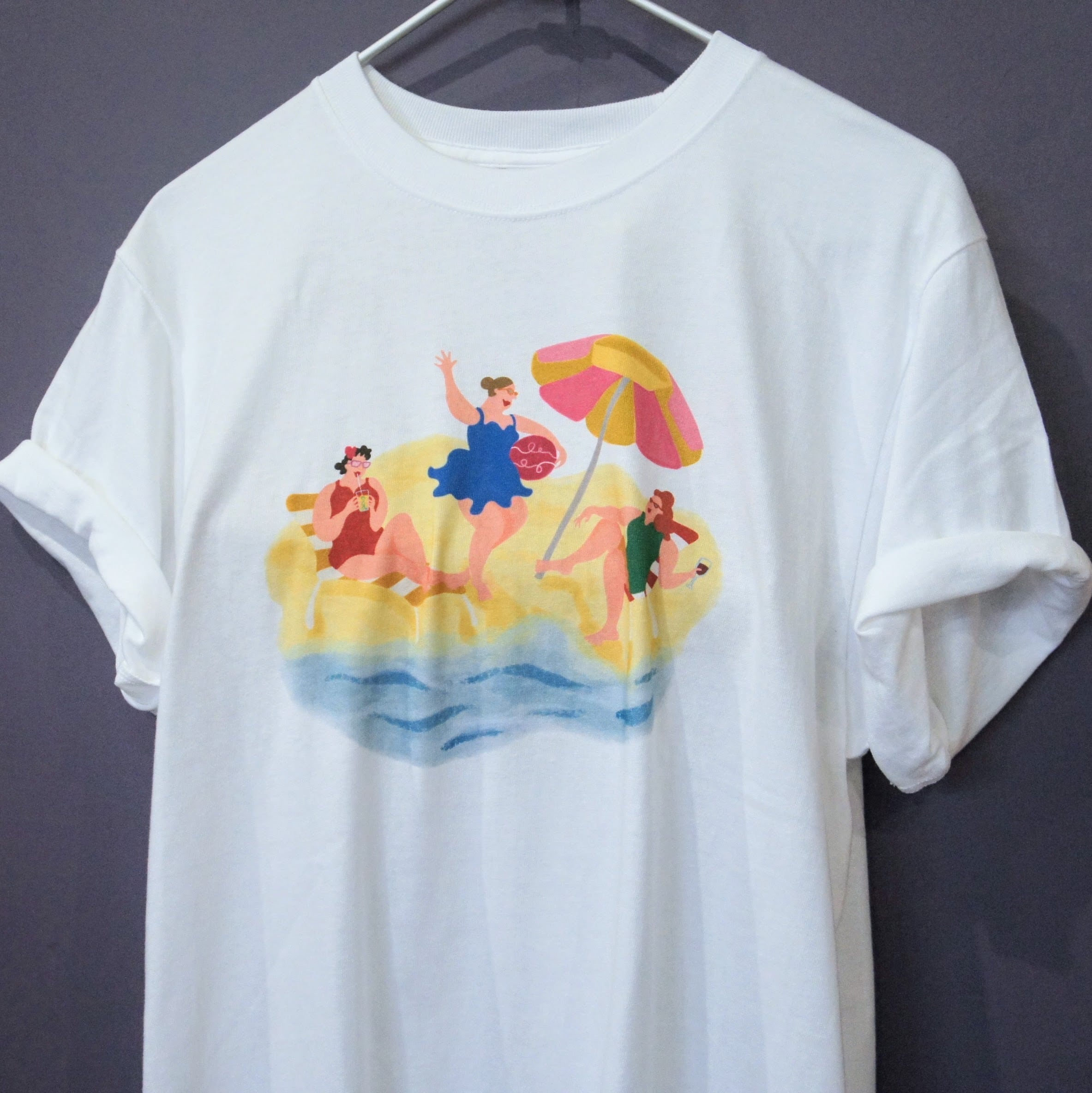 ビーチで楽しむ3人の女性――その瞬間を切り取ったビーチ女子Tシャツは、人気イラストレーター、オリハラケイコさんによるKOGUオリジナルデザインです。